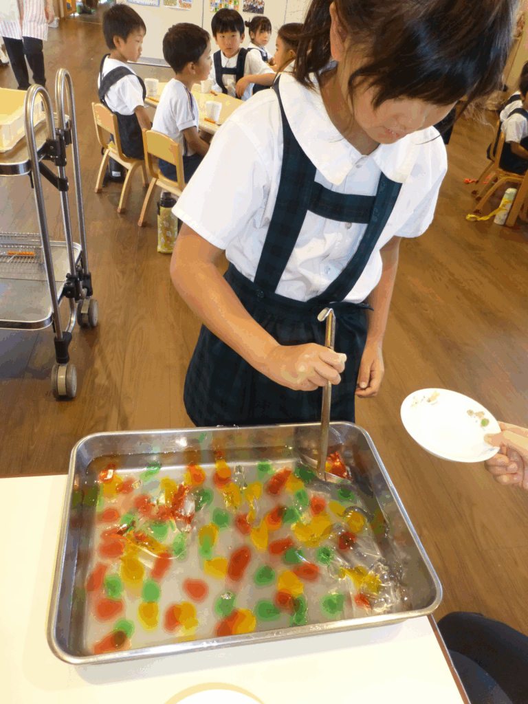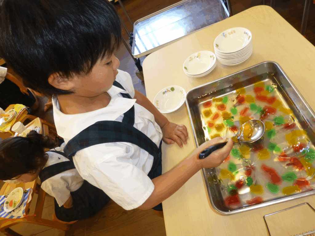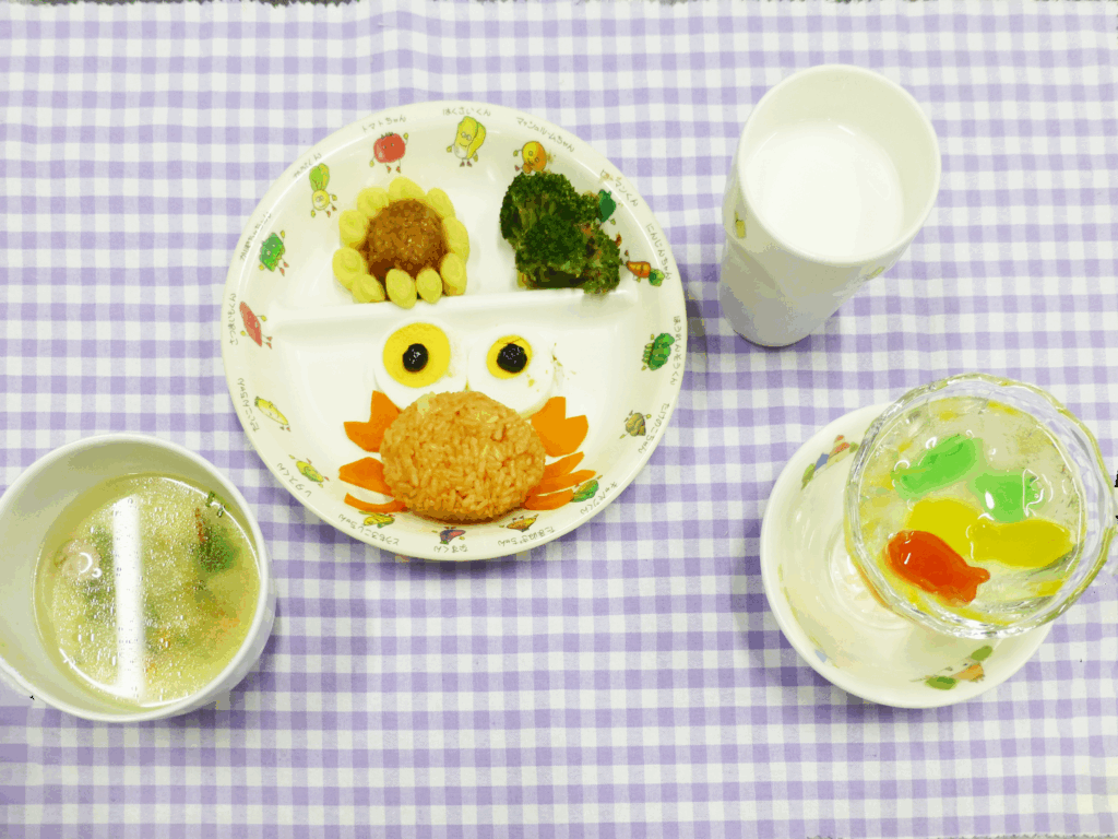 8月の誕生会の給食では夏らしい「カニライス」を提供しました。